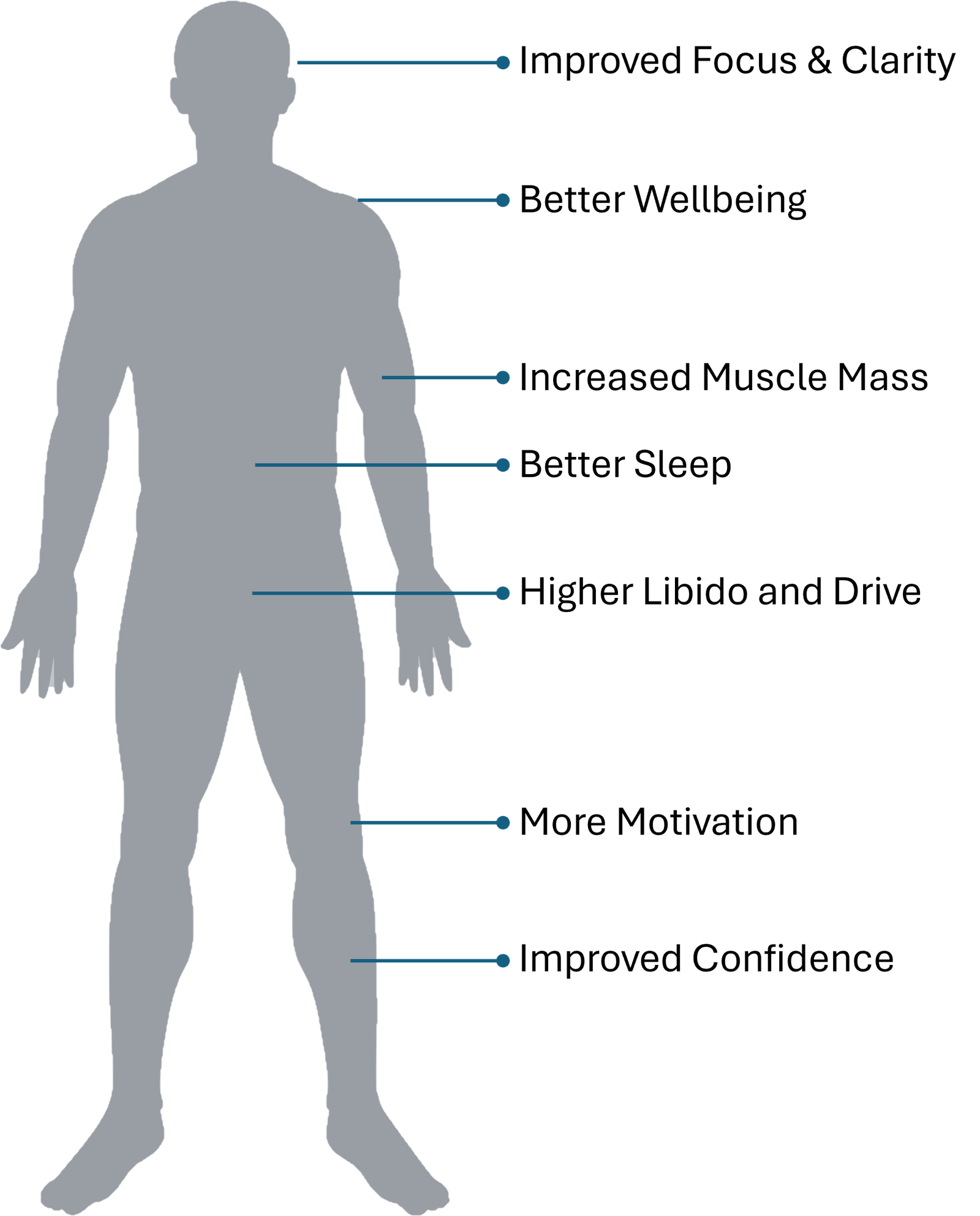 TRT may improve energy levels, libido, mood, muscle mass, bone density, and overall quality of life in men with low testosterone.